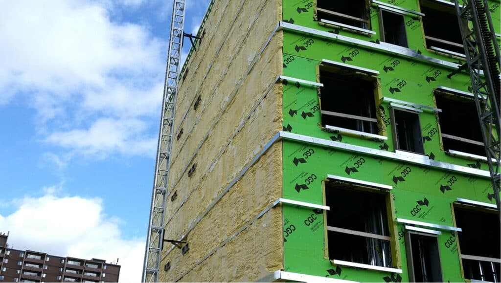 65 unit apartment building in Sudbury, ON with Wrapsulate® applied on the building exterior. R-13 Fiberglass (interior) R-21.5 Wrapsulate® c.i. (exterior) Developer: Dalron Homes Architect: Perry Perry Architects General Contractor: TTS Spray Foam Featured Product: Wrapsulate®